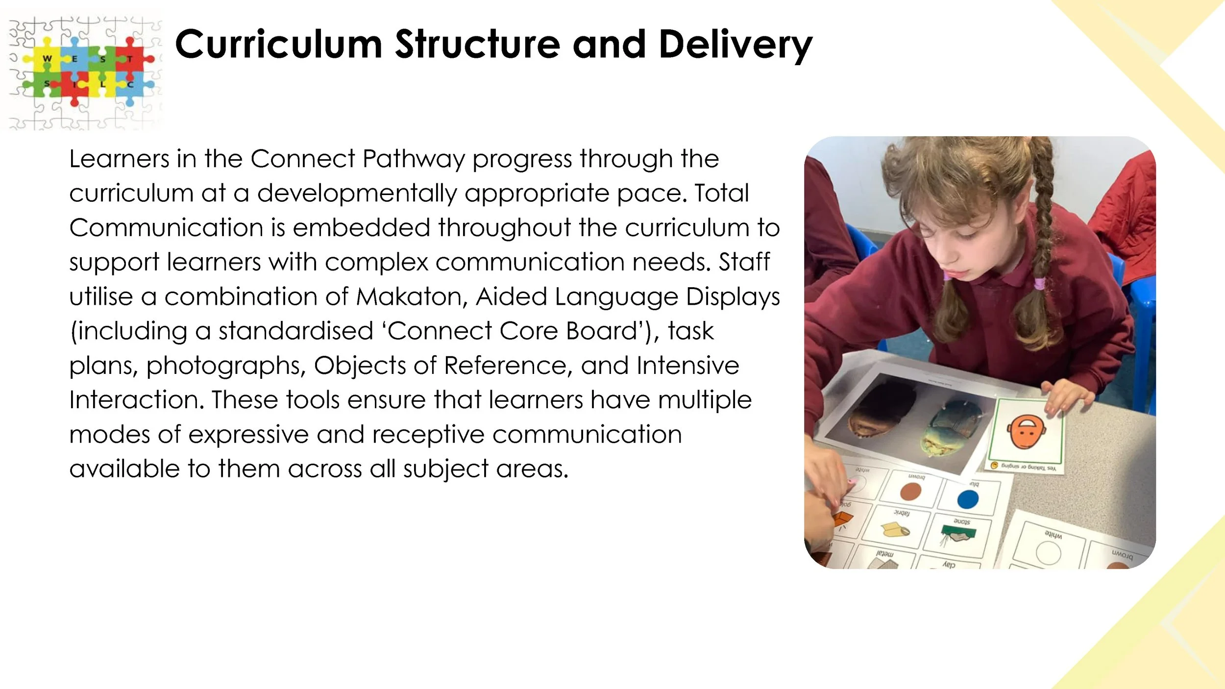 The Connect Pathway supports pupils with severe learning needs, providing access to a highly personalised and adapted National Curriculum tailored to individual sensory, communication, and learning requirements. Learners, typically working below Year 1 expectations, are supported through Total Communication strategies including Makaton, Aided Language Displays, Objects of Reference, and Intensive Interaction. Core subjects such as English, Maths, and Science are delivered through structured schemes, sensory experiences, and meaningful life skills integration.
