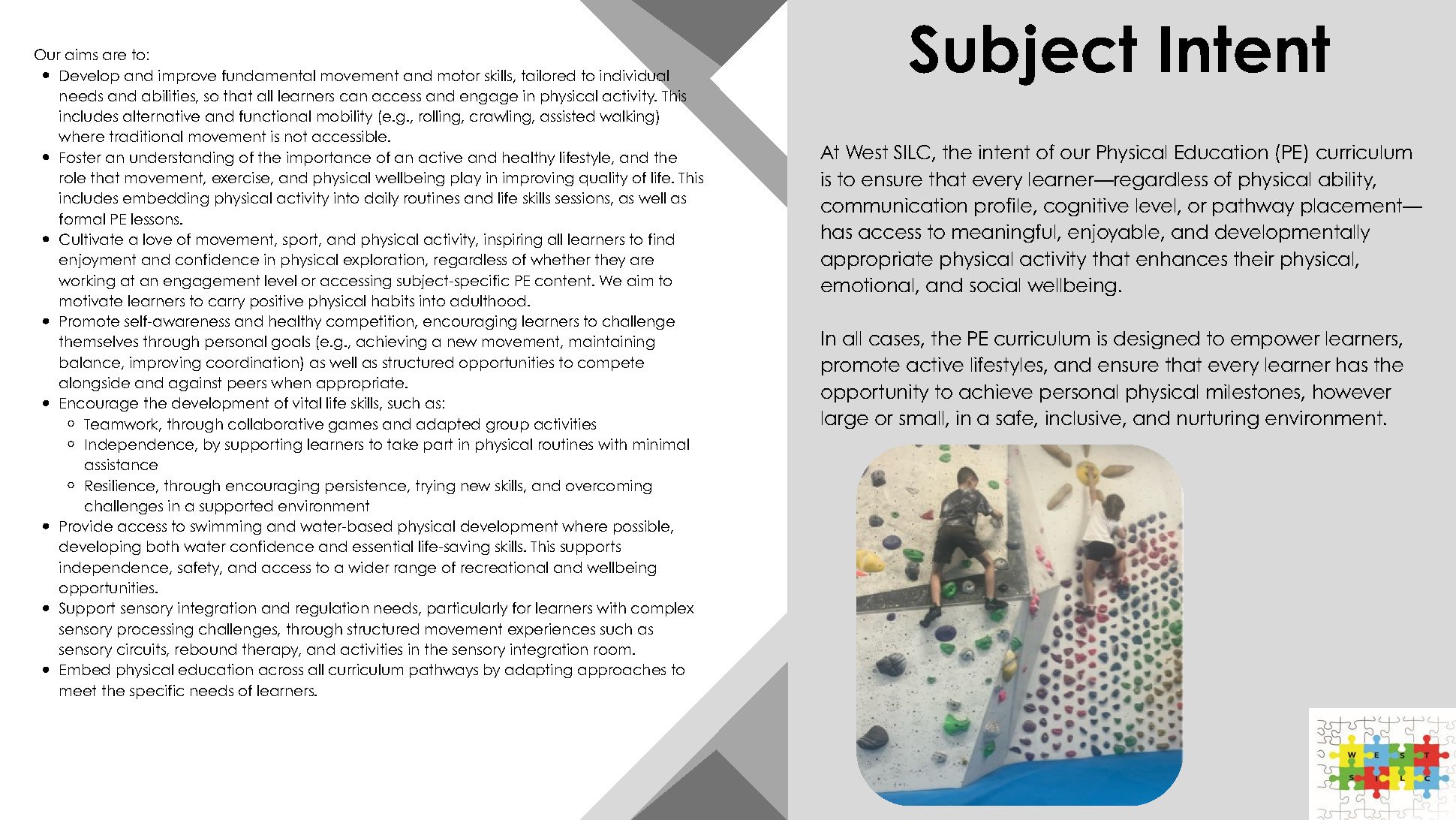 Across all pathways, PE at West SILC promotes physical development, wellbeing, and lifelong enjoyment of movement, ensuring every learner can achieve and celebrate progress at their own level.